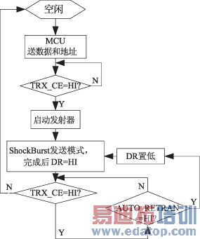 nRF9E5采用Nordic公司的ShockBurst技术(自动处理前缀、地址和CRC),实现低速数据输入,高速数据输出,从而降低了系统的平均功耗。在ShockBurst接收模式下,当收到一个有效地址的射频数据包时,地址匹配寄存器(AM)和数据就绪寄存器(DR)通知片内MCU把数据读出。在ShockBurst发送模式下,nRF905自动给要发送的数据加上前缀和CRC校验码。当数据发送完后,数据就绪寄存器(DR)会通知MCU数据已经处理完毕。当系统没有发送和接收任务时,将进入空闲方式。ShockBurst技术降低了MCU存储器需求,同时也缩短了软件开发时间。
