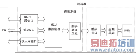 控制系统通常采用ASIC组件和微处理器来实现,主要功能有:与应用系统软件进行通信,并执行从应用系统软件发来的动作指令;控制与标签的通信过程;信号的编码与解码;执行防碰撞算法;对读写器和标签之间传送的数据进行加密和解密;进行读写器和标签之间的身份验证。射频模块的主要功能是:产生高频发射能量;对发射信号进行调制,用于将数据传输给标签;接收并解调来自标签的射频信号。