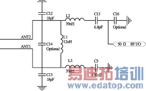 在所设计的系统中,读写器中的射频模块与有源标签中的射频模块电路类似,只是为了更有效地传输射频信号,采用单端连接的50Ω阻抗天线,需要在芯片天线连接引脚和天线之间加一个匹配网络,如图5所示。