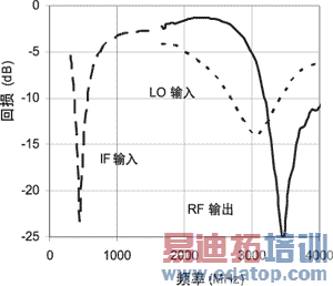 就本应用而言,所测试端口的回损如图2所示。IF端口的回损表明,在375~550MHz范围内阻抗匹配良好。RF输出端口在3.25~4GHz多的范围内匹配良好,而LO端口的回损在2.7~3.4GHz范围内优于10dB。