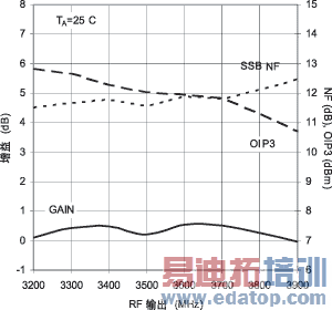 在图3中,转换增益、OIP3和SSB噪声指数是RF输出频率的函数。在这个频带内,转换增益在大约0.2~0.6dB的范围内变化,而SSB噪声指数的变化范围为11.5~12.1dB。OIP3从3.3GHz上的12.6dBm逐步降低到3.8GHz上的11.3dBm。