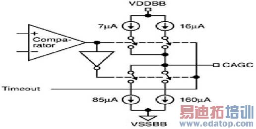 为了进一步改善占空比操作,当该器件脱离断电状态後,其AGC上拉电流和下拉电流必须立即被放大约10ms。这就折衷了AGC电容器的电压下降,减少了恢复正确的AGC电压所需的时间。其中,电流放大因子为45。