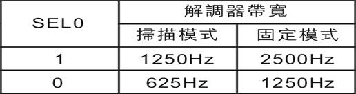 输入管脚SEL0以二进制的步距控制解调器滤波器的带宽,即扫描模式为625Hz至1250Hz,固定模式为1250Hz至2500Hz,具体见表3。默认状态下,SEL1与VSS连接。注意,表1中的值为理论值。滤波器的带宽与频率成正比,因此其具体值取决於操作频率。