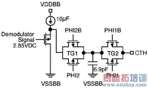 为了达到逻辑电平数据限幅目的,需通过外部滤波电容器CTH和片上开关电容器的电阻RSC对被解调信号的DC值进行压缩,具体参考MICRF009方框图。