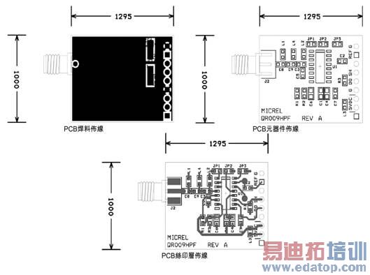 图8为MICRF009 UHF接收器IC的典型应用,该接收器连续工作於扫描模式,典型工作频率为315MHz,并可以通过选择适当的频率基准(Y1),以及调节天线的长度进行定制。如果采用备选输入滤波器,C4的容值也将改变。如果数据率变化1kbps,R1的阻值也必须变化。图8的物料清单见表5,图9是对应的PCB布线图。