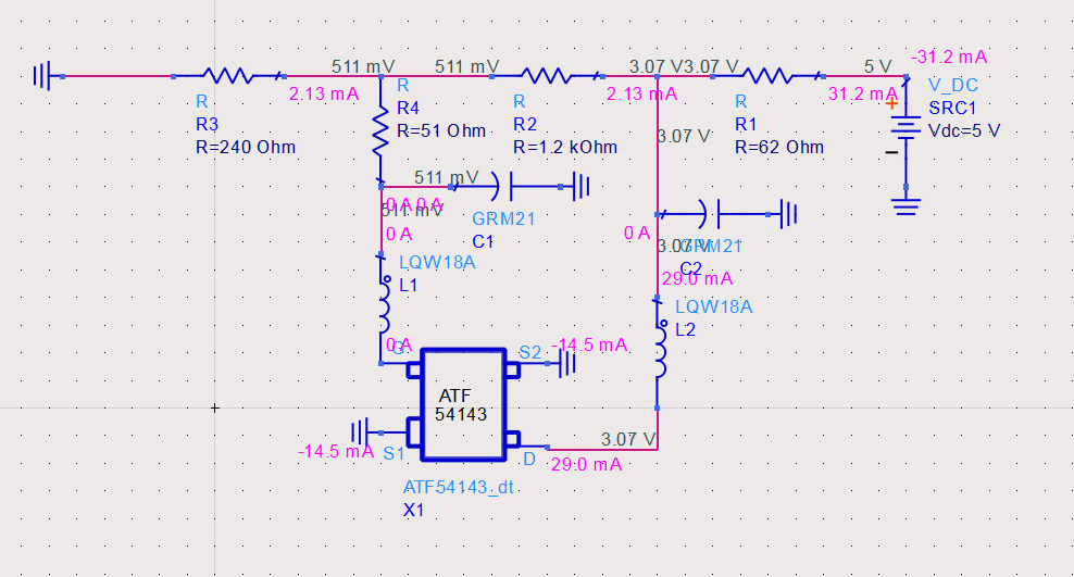 最近在调试一个ATF54143的LNA,中心频率21M,根据计算设计的偏置电压和电流是3V 30ma,ADS DC扫描VGS在500mv左右,多次实测的结果是偏置电流接近30ma,而偏置电压出现多个不同数值,范围在2.8-3.5V之间,VGS有时候会出现负电压,有时候是正300mv左右。现在是通过调整旁路电容的值来使VDS和VGS的电压值与理论计算的数值相近,我想问下出现这些问题可能的原因是什么?为什么在我的VGS和VDS都不对的情况下,我的IDS是正确的呢?原理上旁路电容是不会影响工作点电压的呀,为什么旁路电容的大小会影响工作点电压?附上一张我的偏置部分的电路图,找了很久没找到,哪儿有问题希望大神帮我分析一下原因,谢谢