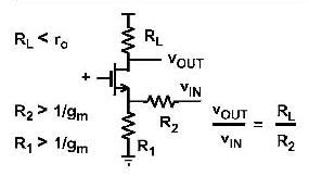 首先 源极source到的信号大小是 vs=vin*( R1//(1/gm) ) / (R2+(R1//(1/gm))) ~= vin*(1/gm)/R2 ~=是约等号