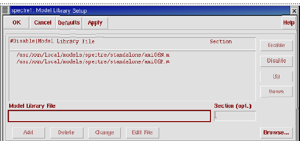 各位大侠,图里的“section”选项下面是什么意思?该怎么添啊?小弟只有一个.scs文件类型的模型文件,电路图里有多个类型的器件,我该怎么添加模型?