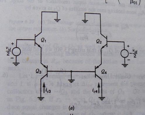 Q3集电极的小信号电流被电流镜复制到了Q4的集电极,由于是输入为差动信号,Q4集电极的小信号电流方向与Q3集电极电流相反,这样就好象是Q3 的小信号电流通过了一个虚拟点直接流到了Q4成为那里的小信号电流。这样就好像在q3和Q4 之间存在一个虚地点,两边的电流一个流进虚地一个流出虚地,就可以和原来的交流通路等效了!其本质和差动对中存在的虚地点是一样的。