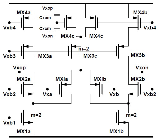 cascode管MX2a/b, MX3a/b的l 可设为最小长度0.18,也就是说这些管子的vdssat可以设计得小点,以保证饱和,而不会影响模块的性能