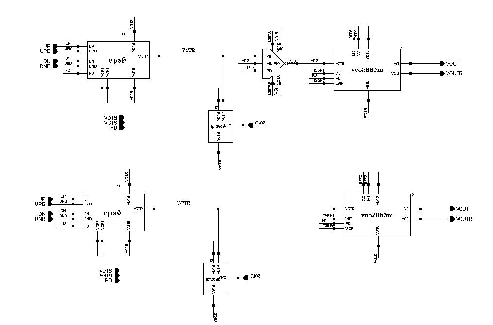 大家好,下图是我画的一个PLL的结构,开始没有加上buffer的时候Vcon上面的噪声比较大,大约0.6mv,仿真的jitters大约12ps,后来我想了想加上了buffer,结果晕死,Vcon上面的噪声是小了,只有0.08mv,但是jitters大道理140ps,结构如下图,谢谢啦以前采用的是下面的结构,后来改用上面的结构瘤