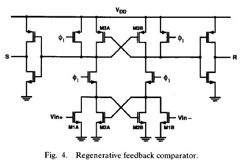 In this latch the cross-coupled devices (M2A, M2B) and (M3A, M3B) are