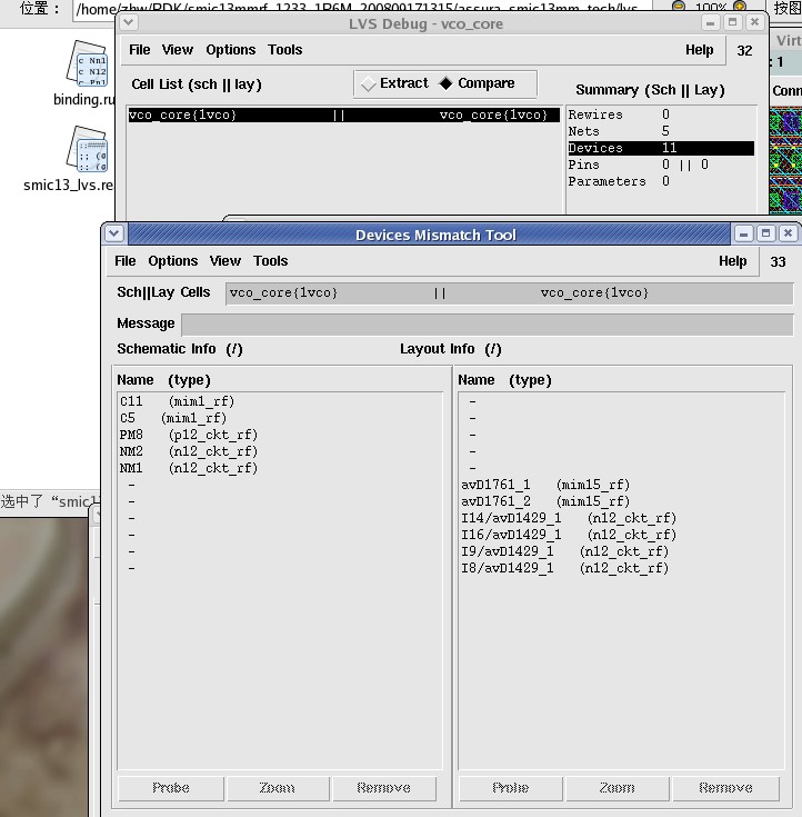 我在用SMIC0.13 做lvs时 软件报错如下图,意思是说有几个器件不匹配,但是我仔细看了下设置,这些器件都是一样的,不知道什么问题,有没有高手帮助下,谢谢!