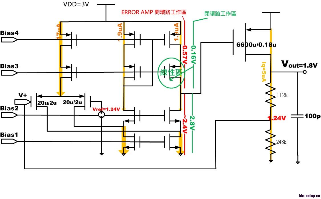 另外,你的power 管子那么大,输出电流非常小,此时power管肯定处于亚阈值区。它的gate与source肯定只比vth低一丁点。如果此时EA的输出范围不够大,你所标识出的那个管子最先进入线性区。当负载电流增加时