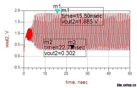 现在VCO已经起振了,但是为什么输出电压一直为正或者负,而不交替呢?请问是我信号源加错了的原因吗?(有个时候输出电压一直为负,在0V以下振荡,我把最上面的VDD设置为3V然后在调回1.8V的时候就一直在0V以上振荡了,完全一样的电路图为什么会这样呢)