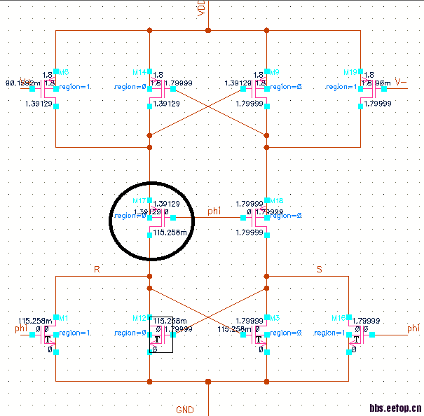 本人在测试可再生的锁存比较器的时候发现输出的R、S存在问题,经测试发现中间的PMOS应该处于导通状态但是源漏端电压不一致,求各位大神帮忙解答,谢谢了~
