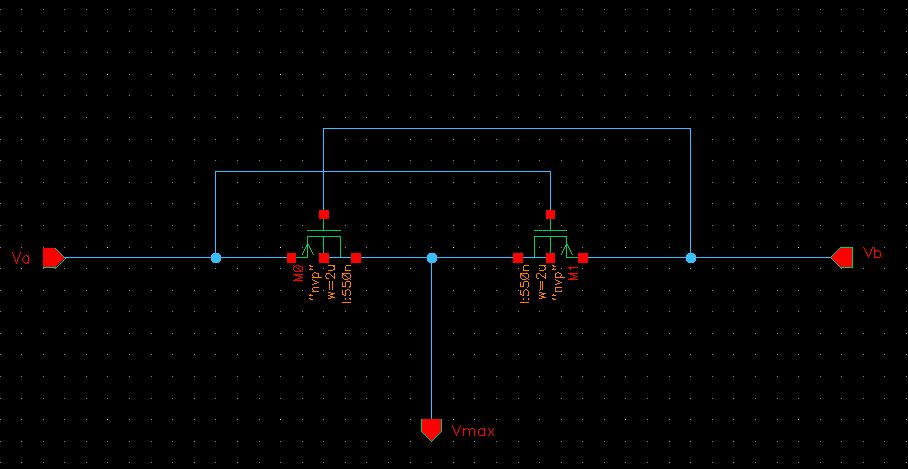 你这个电路有问题把,如果|Va-Vb|<|Vthp|,管子能工作吗?仿真直流工作点的时候,漏电流给输出的寄生电容充/放电,肯定是一个电路给出的收敛的值。至于你这样接为什么可以得到max(Va Vb),就不清楚了