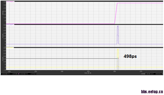 在调节电荷泵时,在PFD输入端加相同信号时,PFD产生一个相同的脉冲信号,脉冲宽度为450pS左右,查看CP的充放电电流是否一致,电荷泵的电流大致一致,但是有延迟。