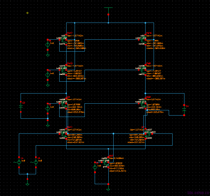 偏置怎么加的?我看着像是都是零似的?Ron是大信号电阻,和你的增益没有任何关系的,小信号电阻是rds,增益是gm*Rout,Rout怎么算书上有。这种电路算是全差分的吧,静态工作点不是调管子的宽长比调的,是用共模反馈做出来的,,你可以看看艾伦或者格雷的书,尤其艾伦上面有很详细的设计过程。还有你的偏置点不是这样加上去的,这样每个vdc去调整多费劲啊,用电流镜去做偏置电路,别怕麻烦,其实比这样好调。