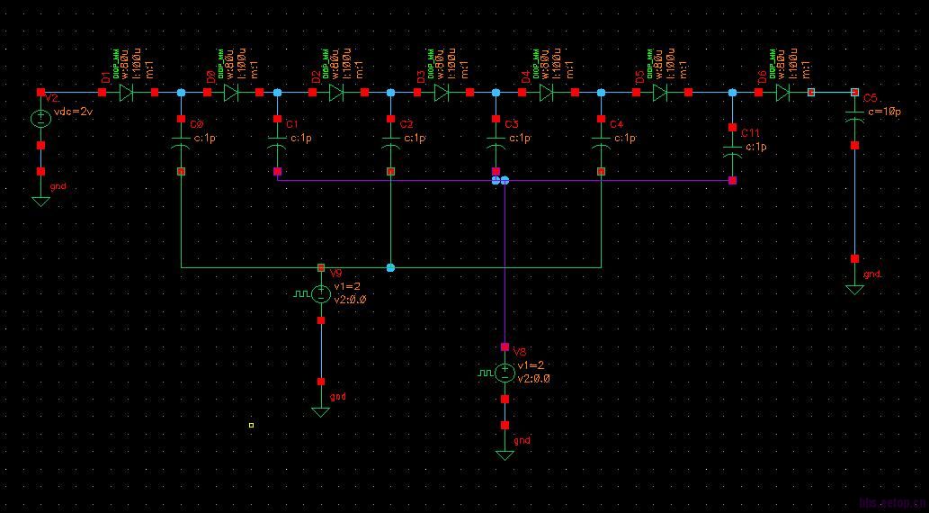 这是很难理解你的问题,读你的阴谋。如果你想知道在低输出电压的输出,它是正常的。既然你有2V VDD和二极管系列二极管压降,在每一步离开你没有额外的电压。即使二极管shotky键入每个二极管会造成损失的~0.4V,由于正向压降的每一步。你不会有任何在最后留下了许多二极管和2V VDD电压。你可以得到它在第一阶段,并开始向输出一步一步去递归。而不是狄克逊与二极管的类型,您可以实现的MOS二极管,所以你将有较小的压降,但您将需要更多的组件和良好的设计,防止闭锁由于身体电压控制要求(电压损耗,由于额外的电容寄生)。有许多例子在文学,所以我不细说了。只是“迪克森电荷泵”在互联网上搜索。