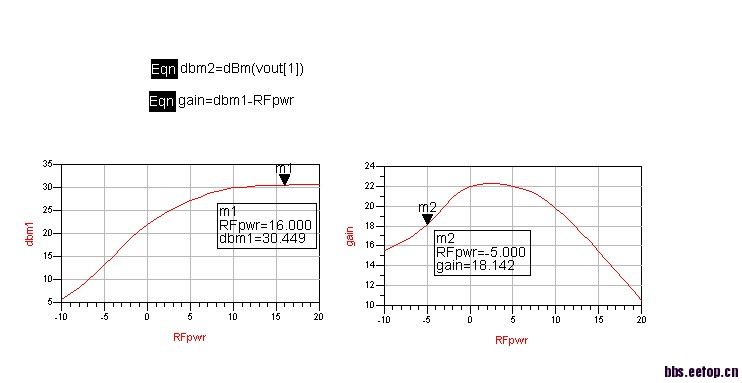 我最近在做的一个基于tsmc0.18um工艺的射频功放吗,结构没什么特殊的,就是最基本的共源共栅结构,仿真结果如图所示,第一个是输出功率dBm vs 输入功率RFpwr,第二个图形是增益vs RFpwr,从图中可以很明显的看出来增益上翘。我一直苦苦思索找不到原因,求大侠指导啊。另外我偏置在特别靠近B类区域。