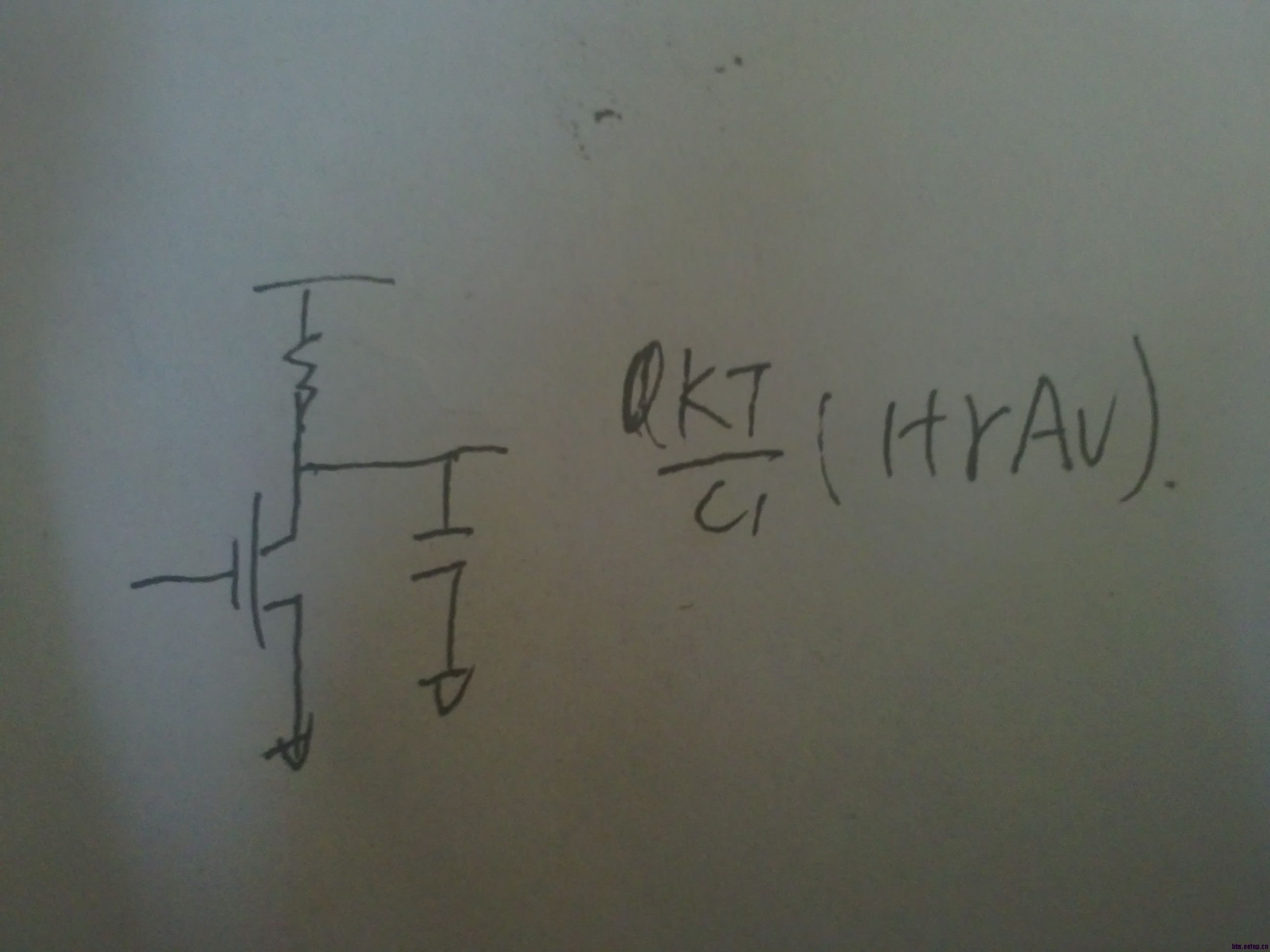 MOSFET current noise 4KT*gamma*gm=(4KT/R)*gamma*gm*R=(4KT/R)*gamma*Av. The total output noise voltage due to (4KT/R) is KT/C, so the total is as shown above, since the two current sources are uncorrelated.