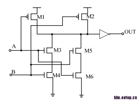 各位前辈,小弟用cadence仿真两输入与非门时,输出波形不正确。电路图如下