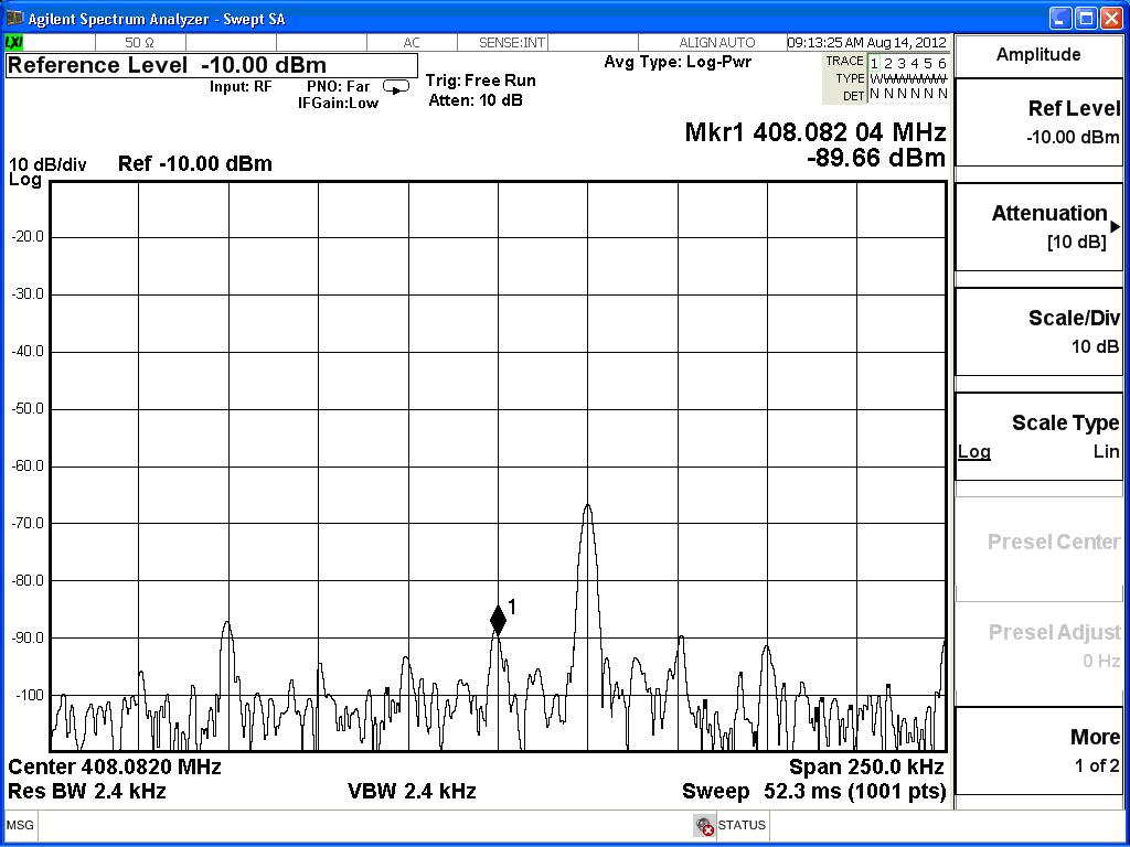 基带输入二路25KHz正交正弦信号,经DAC,滤波器和UP-Mix和Buffer以后输出频谱如图1所示,左下角估计为干扰,