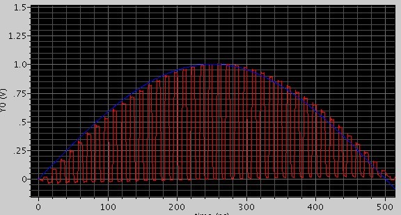 把运放接到采样保持电路后,输入为1V的差分信号,它在5ns内达到所要求的建立精度(999.75mv)以上。输出如下图所示。