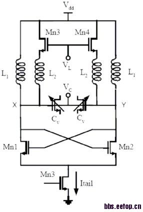 这个应该是开关电感结构吧?用于产生两个频段上的VCO。频率范围主要有:(CV, L1)(CV, L1, L2),它的特点就在于Mn3和Mn4控制电感接入还是未接入。另外L1、L2要是在版图上有特色的话,应该有一定创新的。其实很多论文是有测试结果就好发了。