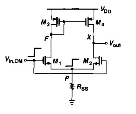 假设M3M4相等,M1M2相等,输入端短接。测出共模增益随频率的变化后就会发现,X点和F点的增益在高频时显著不同,因为X点有一个零点,是由于另一条支路在高频时“不给力”后所造成的。看下图