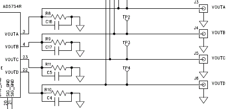 如图,AD5754是16位电压输出DA,VOUTA,VOUTB,VOUTC,VOUTD是四路电压输出端。