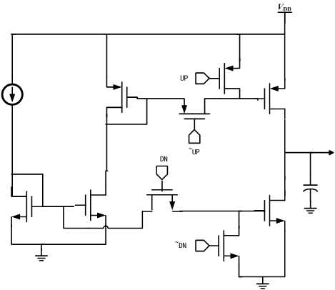 如图所示是我仿真PLL时控制电压的输出结果,我觉得奇怪的是Vtrl的值应该是从0V开始上升,可是我这里却是从电源电压开始下降,可是我并没有在仿真的时候给予Vtrl一个初始值,照理说应该是0V才对呀,还是说由于一开始CP没有工作,CP所有的管子都不工作,使得输出就是为电源电压?CP的电路图如上所示,请各位同学帮我看看!感激不敬!