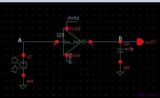 请问这样的测试方法正确么?电路接法如下,激励源给周期为1M的方波信号,负载接1P电容,然后仿真,测输入A点的电流和输出B点的电流,A点电压在跳变时,由于输入电容的存在电流会变化,测出最大电流峰值即是反相器所需的最大驱动电流,同理在B点测得的是反相器输出的最大驱动电流