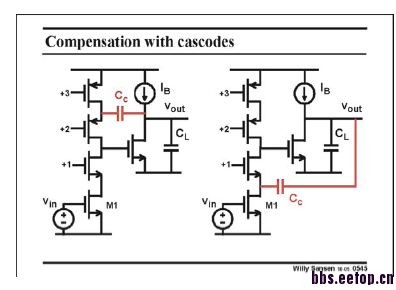 直觉上左边的前馈电流从M1要经过两个共栅管到达Cc,路径上有更多极点因而前馈要比右边的更弱