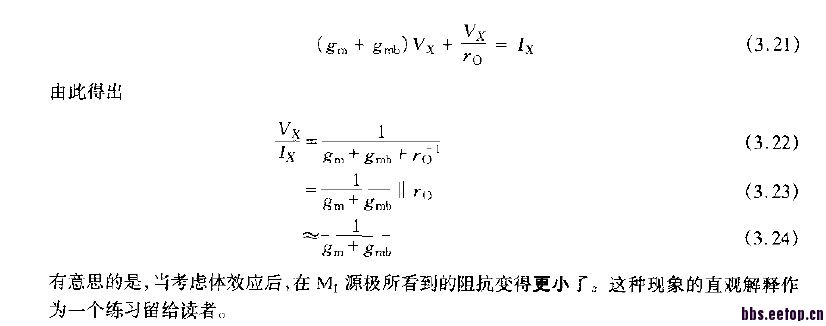 直观看源级电阻是三个电阻并联:1/gm,ro,1/gmb。 注意:是小信号模型,体效应导致新增加一个电流源。 建议小编仔细理解考虑体效应后的小信号模型,尤其是新增压控电流源的方向