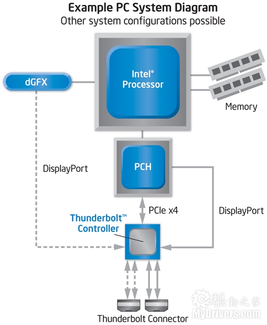 Thunderbolt接口由Intel的一颗控制芯片驱动,并通过PCI-E x4、DisplayPort总线与系统芯片组相连,也可以直接连接Intel处理器内集成的图形核心进行DisplayPort输出。