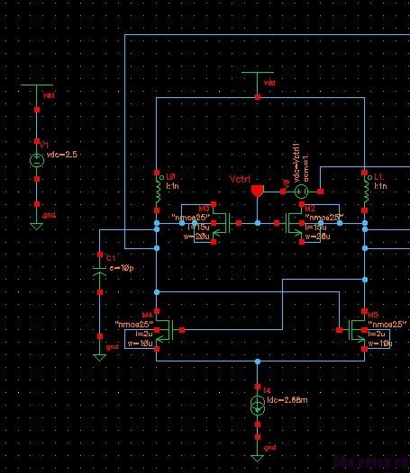 小弟菜鸟一枚。求大神帮忙看一下!下面两个管子M4 M5是做负阻的,现在想做tran仿真看看是否起振,输出点选择的是M4(或M5)的漏极,就是vdd经过电感L后的点,为什么仿真的出来的电压就是2.5V(Vdd的直流值)不变呢?电感不分压么?M4的漏极电压波形不应该是一个类似于正弦波的形状么?怎么调整才能让电路振荡起来啊,或者在哪个点仿真?跪求大神指教!