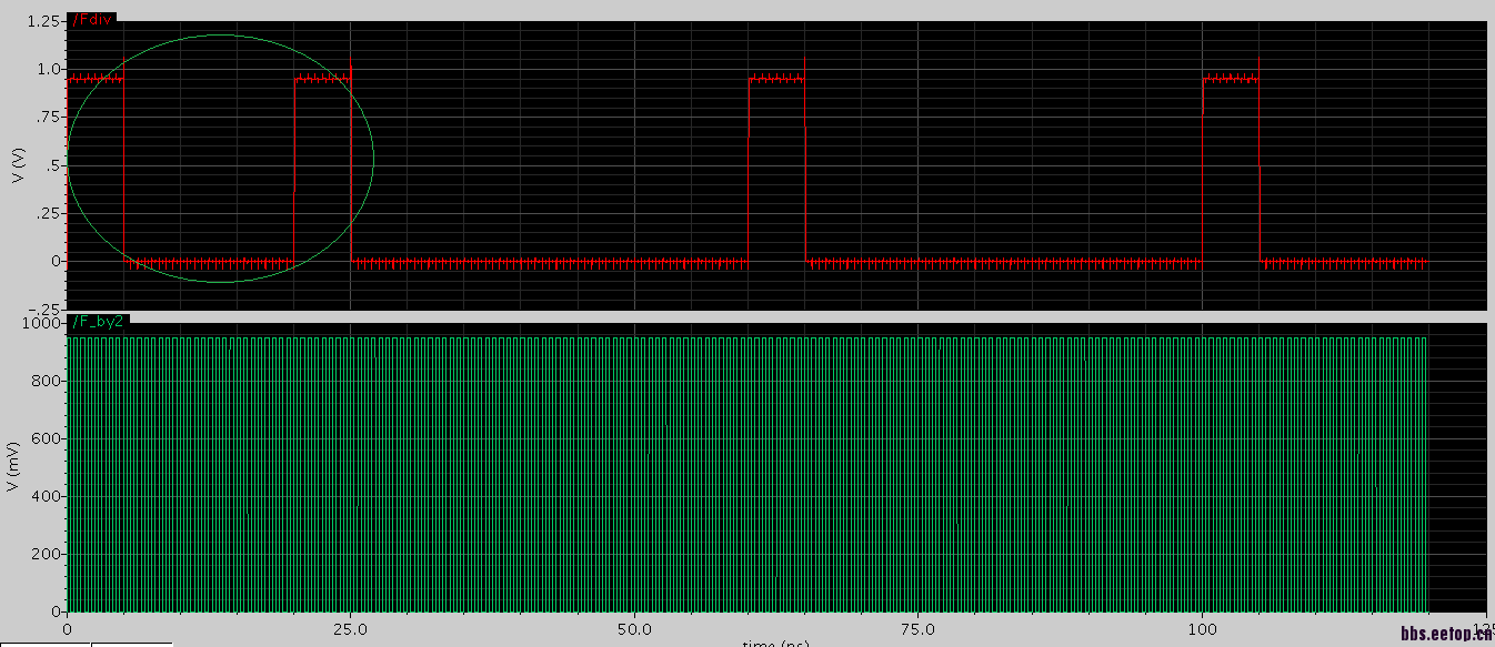 请问,扩展分频范围后的modular divider的输出波形的开始部分会有一段不想要的高频部分(见下图圈出),采用什么方法可以消除?