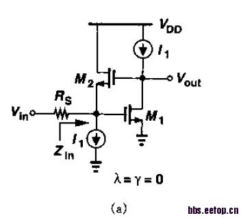 求解左图的输入阻抗。拉扎维的答案如下图,他是把Vin和Rs用诺顿等效代替来进行计算的,并把Rs看作放大器输入阻抗的一部分。我的疑问是Zin|open为什么是1/gm2而不是Rs||1/gm2呢?