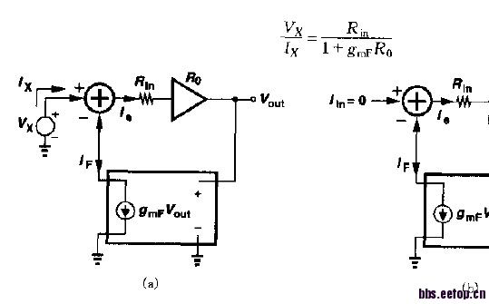 用诺顿等效的时候,Rs已经看成是M1的输入阻抗呢,这样电流源才是理想的电流源。既然Rs已经被看成M1的输入阻抗,因此在环路之内。所以我觉得Zin|open=Rs||1/gm2,而Zin|close应该为Rs||1/gm2/(1+环路增益)然后减去Rs的部分。下图是拉扎维对电压电流型反馈输入电阻的推导,我觉得Rs已经被看作Rin的一部分呢。