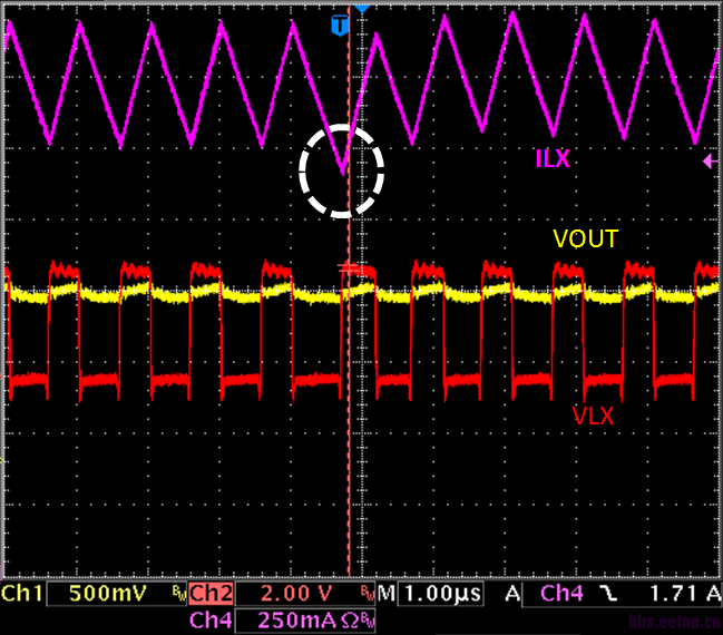 当我 VIN = 3.3V, VOUT = 1.2V, 用负载机抽 1.8A 的电流,电感电流有异常,如白色圆圈所示。