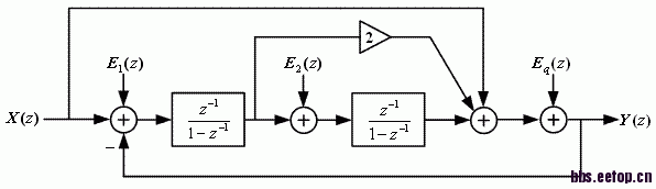 小弟研究二阶DSM中每级的噪声影响时看出第一级噪声E1直接加入信号,E2被一阶整形。当我把DSM变为三阶时看出E1仍然是直接加入信号,E2被一阶整形,同时E1的影响是最大的