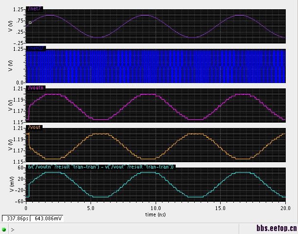 小弟在仿DAC的tran时,结果很奇怪 在仿真时间比较短20n时出现的结果很好,比较理想。但问题是但仿真时间加大到400n时看到的结果很差 出现了很大的毛刺。按说时间加长不至于结果不一样哈 求高手解释下 多谢