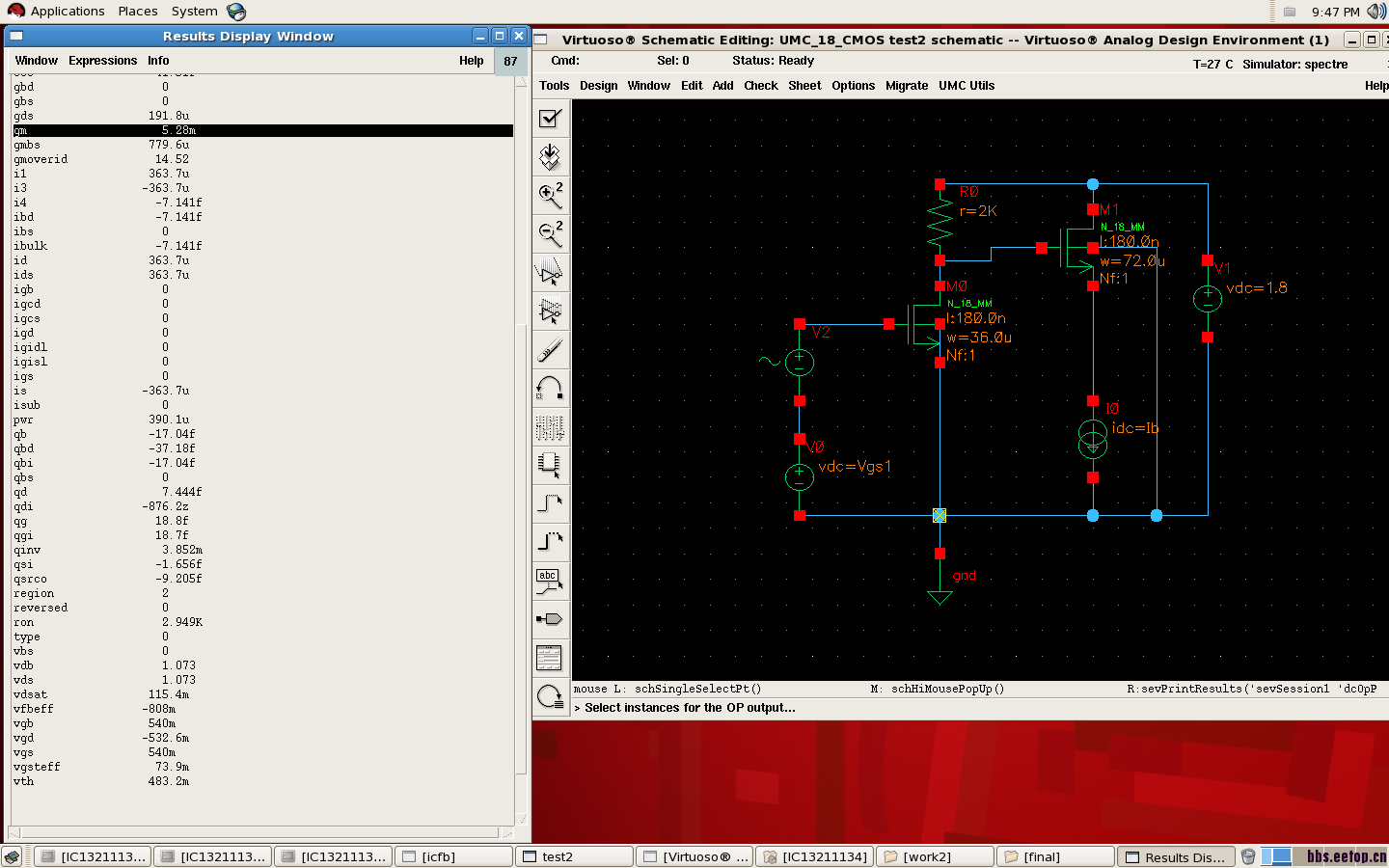 下面的图是同学做的实验,他用了短沟管0.18um,我实在想不出为什么跨导会那么大,左边是第一级mos管的工作点按速度饱和区公式我推的跨导不到2ma/v,可是他做到了5个多ma/v,经典饱和区就不说了,还有一个问题是工艺文件里给的vth是0.3075V,为什么这里会变成0.48v呢,也不存在体效应啊,我把管子换成长沟管,立刻数据就和算的差不多了,就是不太明白短沟管的这些效果,希望大神们帮忙解答下,谢谢了
