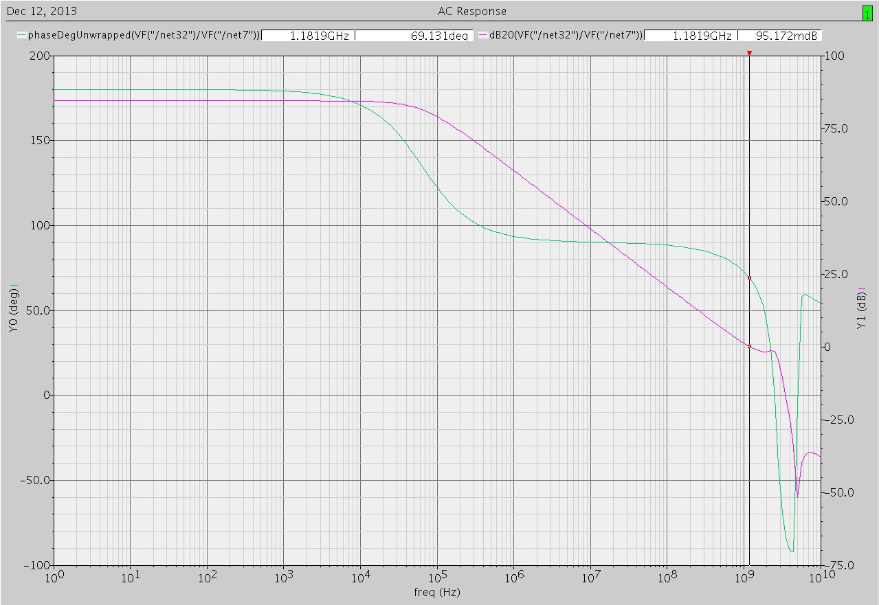 好像在次极点附近有个零点,而且这个零点好像还是右半平面的,而且瞬态中从低到高跳变时有一个先下降的尖峰(由高到低好像也有一点尖峰),所以我觉的是右半平面的零点引起了建立时间太长。