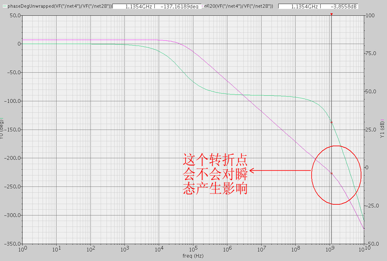 带了一个2p的负载,我在想,第二个极点那对瞬态有没有大的影响,现在在带外,GBW为700M,-135°为1.1G左右,这个极点会不会对瞬态产生较大的影响,采样频率为60M的话,能不能建立