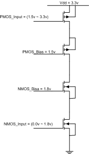 权当是抛砖引玉吧,我给一个用1.8V mosfet 做3.3v的基本电路. 出了这个以外,你还需要一个level shifter,把你的0v-1.8v的输入变成1.5v-3.3v,作为pmos的输入.这样的level shifter应该蛮多的.