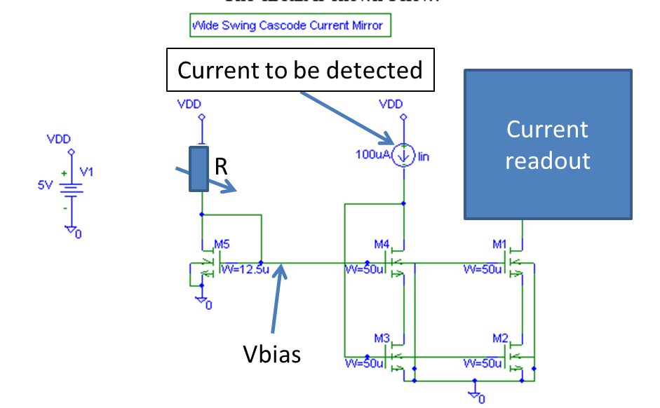 大家好,下图中的wide swing current mirror 的偏置由M5和可变电阻R共同产生,可变电阻R在片外。把这种方法称为方法1。