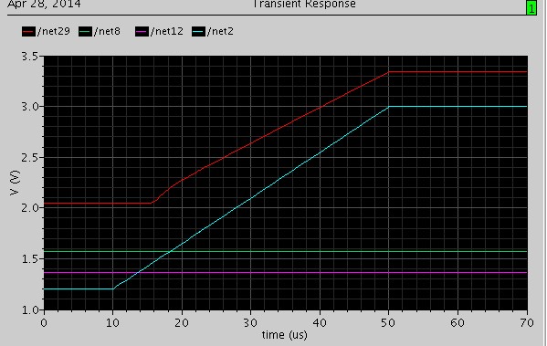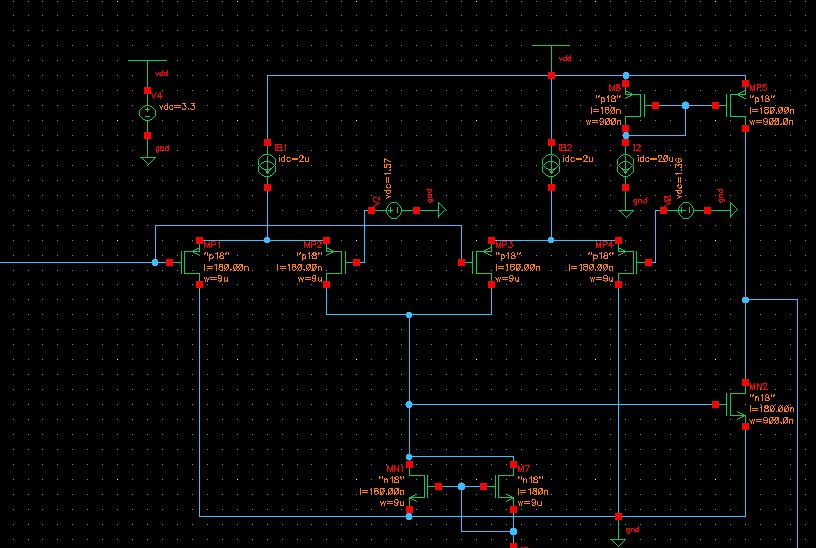一个窗口比较器,目前仿真出来输出一直是低电平,目测放大器没有工作,按所示电路图设计,VN3节点(即所示仿真图的输出)电压应该满足如下,但是在输入进入窗口电压范围时,节点电压还是升高,所以比较器输出一直是低电平。